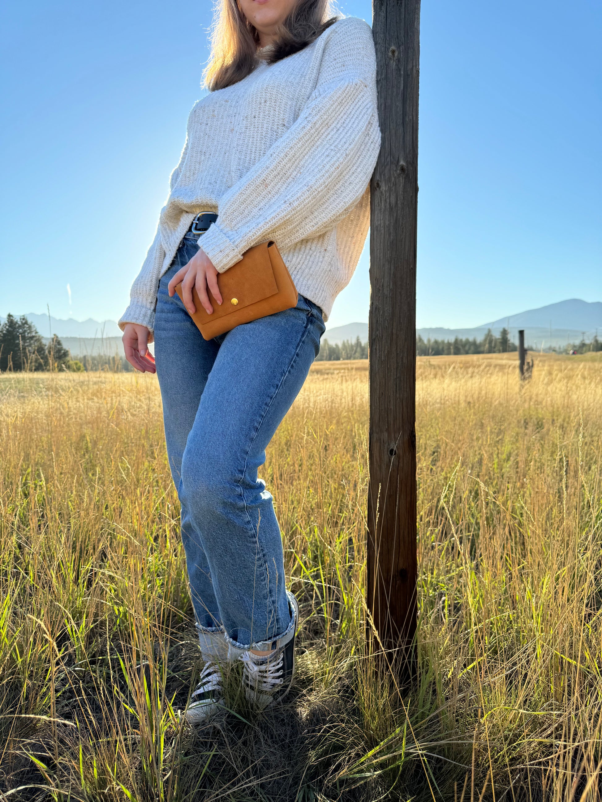 A small one pocket clutch, designed to hold your phone, keys, cash, and more! Perfect to drop in your hand bag, or carry as a hand purse! This leather is a golden brown, with a micro-suede feel to the touch