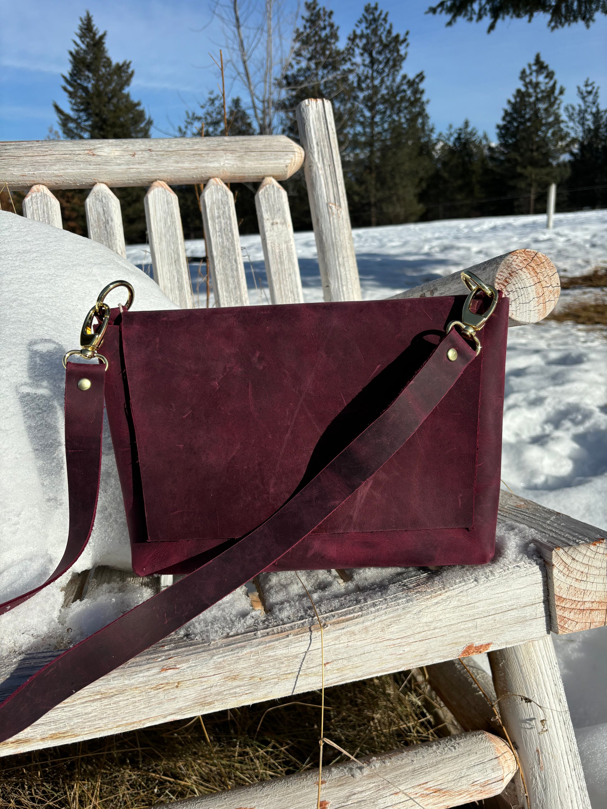 A simple square handbag with a long over the shoulder or crossbody strap. This leather is a vibrant plum and burgundy mix, with colour variation throughout! It has a slight micro-suede texture