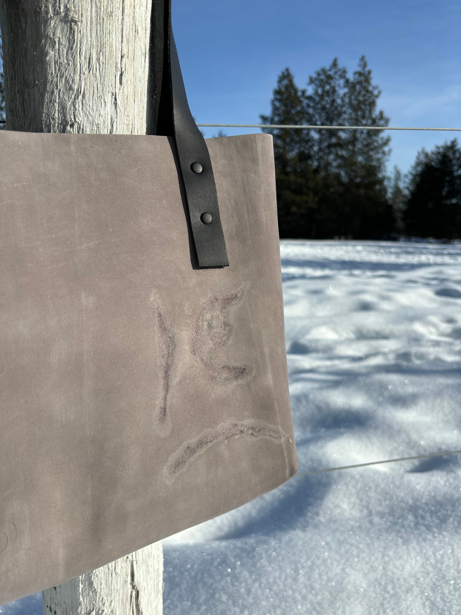 A simple and classic tote, handcrafted from leather. This leather is a matte grey, with undertones of light purple. It has a slight micro-suede touch, and features a unique branding on one side of the bag!